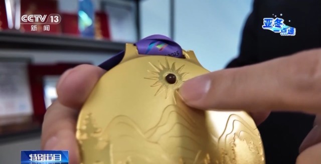 第九届亚冬会奖牌设计团队负责人 邹存亮:亚奥理事会标识,镶嵌了我们黑龙江的瑰宝,逊克的北红玛瑙,使整个奖牌更具有画面效果,也像太阳一样生机勃勃。我们也是采用2008年奥运会的制作工艺,把玛瑙镶嵌到金属上,外边我们又增加了保护膜,使玛瑙不至于轻易脱落。